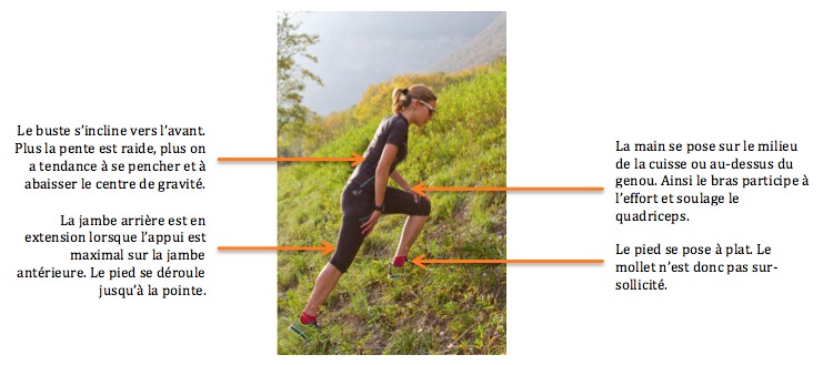 Sur une pente forte (environ 15 %), le corps est très penché vers l’avant, abaissant ainsi le centre de gravité. Les épaules ne doivent pas se contracter afin que la cage thoracique reste bien ouverte et offre une bonne amplitude respiratoire. Les mains viennent se poser sur le milieu des cuisses ou juste au-dessus des genoux afin de soulager les membres inférieurs et favoriser la poussée vers l’avant. Les foulées s’allongent, ce qui permet de compenser la perte de fréquence qu’implique la marche. Pour éviter de trop solliciter les mollets, le pied se pose à plat. « Les enjambées ne doivent toutefois pas être trop longues car elles nécessitent alors un tel niveau de force qu’il est difficile de tenir l’effort dans la durée », ajoute Julien Rancon. La jambe antérieure est bien évidemment fléchie tandis que la jambe arrière peut soit s’étirer jusqu’à être totalement tendue, soit être laissée légèrement fléchie en fin de poussée. « D’après des études médicales, le fait que les jambes ne soient pas tendues favoriserait le retour veineux et donc l’oxygénation musculaire », précise Julien Rancon.